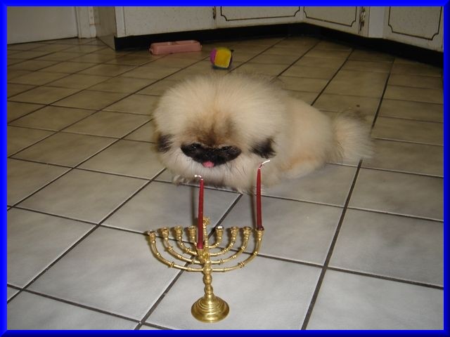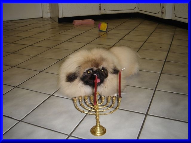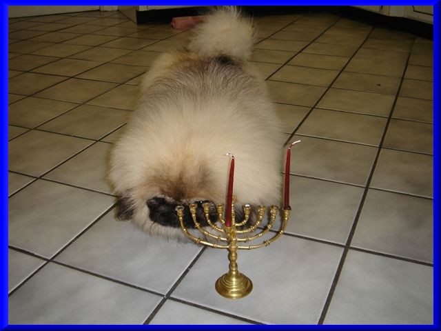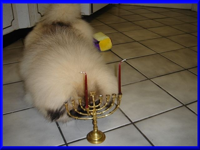 | KaShi's first Chanukah, December of 2005, right after his adoption. He's learning about the menorah and Chanukah, because he had just come from a home with a Christmas tree. ggg |